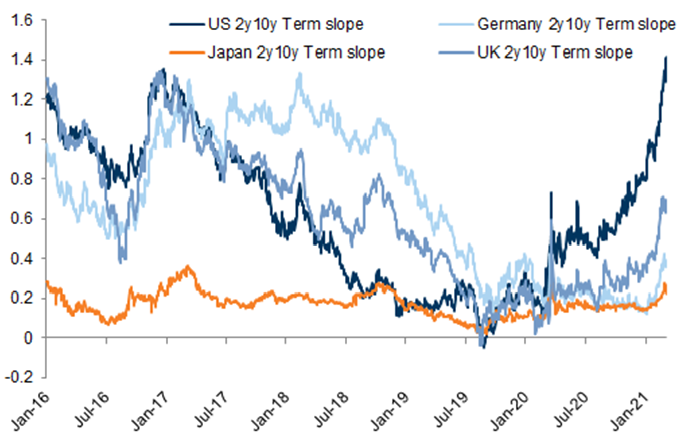 The ultra-low interest rate environment has fuelled the attraction of companies with specific characteristics over the last ten years. The return that investors require to hold long duration assets has collapsed in line with the current interest rate environment. It has also supported the implicit view that these longer-term profits are 'secure', which may be an over-optimistic assumption. Now, the situation seems to have changed and the record monetary and fiscal stimulus poured into economies have created a substantial steepening of the yield curve. Over the last few months, US ten-year bond yields have risen more than 100 basis points, and this is now also affecting global bond markets. Financial markets are trying to accurately price in higher inflation expectations on the back of soaring commodity prices and record stimulus. The rise in long-term interest rates will eventually become a parallel shift in the curve.