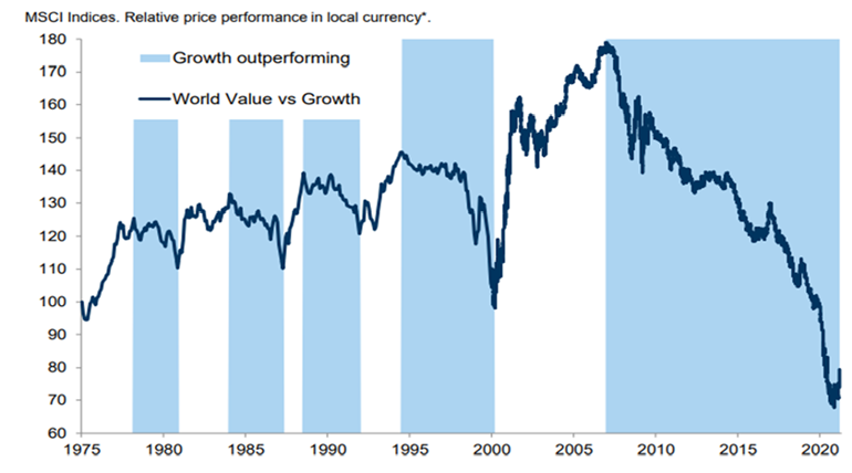 Chart 1 – World Value vs Growth since 1975 (Source: Goldman Sachs)