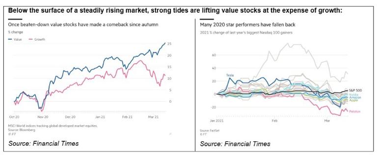 The global value benchmark is up 4.5% since the start of this month and 9.1% higher than the beginning of February[2], while the value-centric Dow Jones Industrial Average last week reached the highest point in its 125-year history[3]. At the same time growth stocks have tumbled and the tech-heavy NASDAQ 100 index last week entered correction territory after dropping more than 10% from its own record high.
