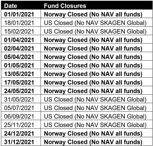 SKAGEN funds' trading calendar for 2021 is listed below. Any changes will be published on the SKAGEN website at www.skagenfunds.com.
