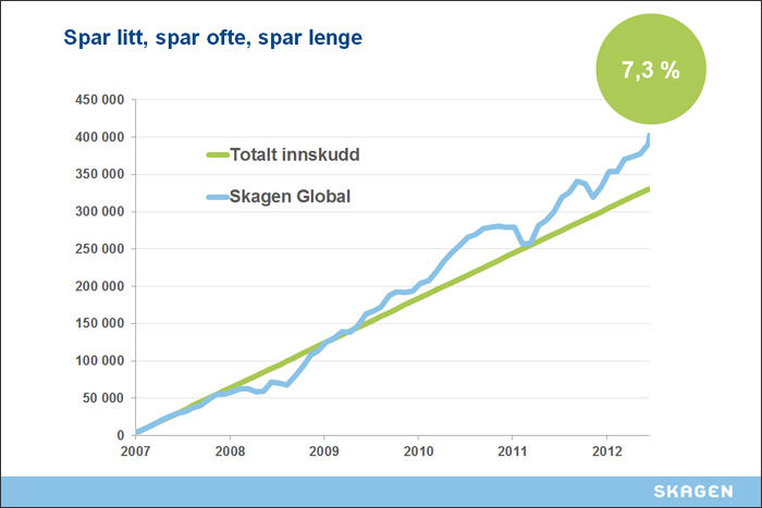 Hva hvis du fremfor å plassere et engangsinnskudd sommeren 2007, opprettet en spareavtale som løp i 5,5 år? Da ville årlig nettoavkastning blitt 7,3 %. Ganske imponerende i en periode der fondet har gitt nullavkastning.