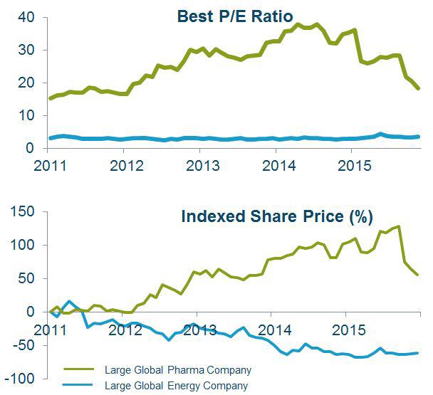 Example: Investors would have lost out by sticking with this very low P/E energy company (blue line) based on price alone, or riding the wave of the pharma company (green line) for too long.