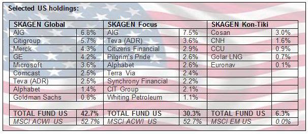 SKAGEN Global has the largest exposure to US-listed stocks across our equity funds at around 40% of the portfolio (see table below). This has remained broadly unchanged throughout the year although it has increased slightly in the third quarter, largely as a result of strong performance from the fund's two largest holdings, AIG and Citi. SKAGEN Kon-Tiki has only 6% of the fund invested across five US-listed companies, all of which operate globally with significant emerging market exposure (e.g. Cosan and CNH Industrial).