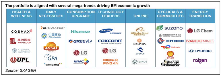 The majority of SKAGEN Kon-Tiki's negative return this year is attributable to its five Russian holdings which made up around 10% of assets at the start of 2022 but were written down to zero following the invasion of Ukraine. One is X5 Retail Group, which is held via depositary receipts listed on the London Stock Exchange. Trading in these has recently began off-market, leading to a positive revaluation of the position.