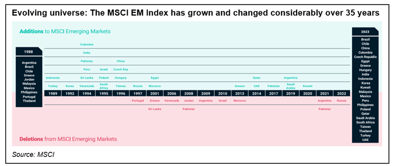 The term ‘emerging markets’ first appeared in 1981 to encourage investment into ‘third world’ economies. The investable universe has changed dramatically since MSCI launched its first EM index seven years later to satisfy investor appetite for exposure to fast-growing countries benefitting from rising living standards and trade globalisation – membership has more than doubled to 24 countries with 26 joining and 12 exiting over the years (Argentina has been in, out, in and out again).