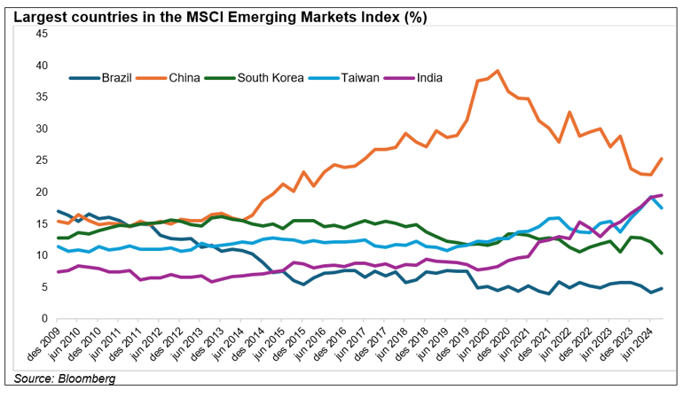 Despite not joining the index until 1996, China has been its largest county representative for over 15 years and now makes up 27% of the investable universe, down from around 40% during COVID but arguably still large enough to distort the index.