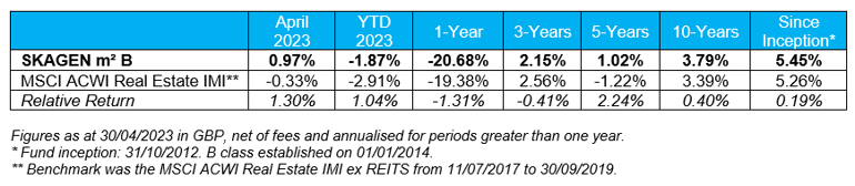 Grainger led absolute and relative gains as European real estate recovery continued. SKAGEN m2 added 0.99% over the month, outperforming the MSCI All Country World Index Real Estate IMI benchmark which dropped 0.29%. Read the SKAGEN m² April 2023 report for more information.