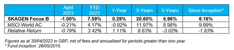 Canfor Pulp weakness offset Sao Martinho strength as Persimmon joined portfolio. SKAGEN Focus dipped 0.98% during the month, lagging the MSCI All Country World Index which fell 0.17%. Read the SKAGEN Focus April 2023 report for more information.