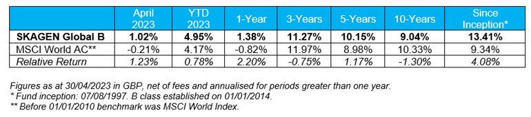 Brown & Brown led absolute and relative gains as holdings reported good Q1 earnings. SKAGEN Global climbed 1.03% during the month, outperforming the MSCI All Country World Index which dropped 0.17%. Read the SKAGEN Global April 2023 report for more information.