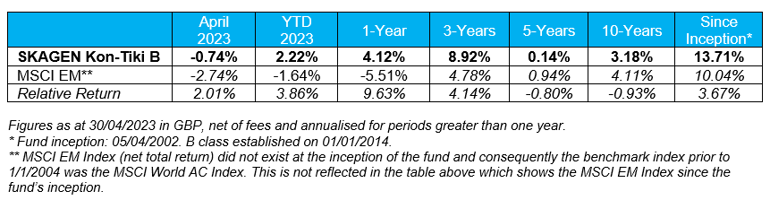 Chinese holdings drove relative strength as Gedeon Richter rejoined the portfolio. SKAGEN Kon-Tiki was down 0.73% during the month, beating the MSCI Emerging Markets Index which was 2.70% lower. Read the SKAGEN Kon-Tiki April 2023 report for more information.