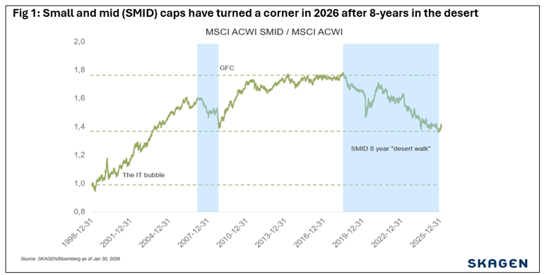 With around 40% of the portfolio invested in European equities (versus ~15% of the global benchmark), our small and mid-cap fund, SKAGEN Focus, has had a very strong start to 2026. It has gained 9% year-to-date in EUR – over 7 percentage points ahead of the index[3] – which follows a strong end to last year which helped the fund outperform over 2025.