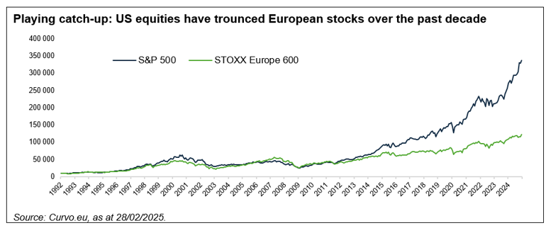 Following its strong start, the Euro Stoxx is now expected to be the top performing index this year according to nearly a quarter (22%) of respondents to Bank of America’s February survey, followed by Nasdaq (18%). A European victory in 2025 would still make little impression on the longer-term dominance of US equities with the S&P 500 total return more than double that of the Euro Stoxx 600 since 2012 when the markets began to decouple.