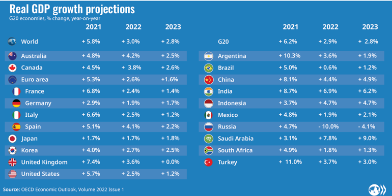 Despite downgrading forecasts, the OECD believes economic growth will remain positive with global GDP expanding 3.0% this year and 2.8% in 2023. All major economies except Russia are predicted to avoid recession and they see little risk of repeating the 'stagflation' of the 1970's when high inflation met surging unemployment.