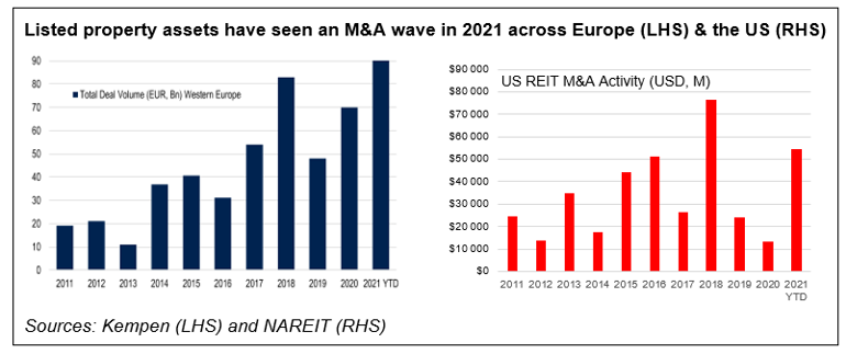 After the unique events of last year, 2021 has broken new records for consolidation in listed real estate markets. With a quarter of the year remaining, European M&A volumes have already surpassed the previous record in 2018 and are up nearly 30% on 2020 which was the next busiest year. It is a similar picture across the Atlantic where US volumes have already reached $50bn and are on track to come close to 2018's record.
