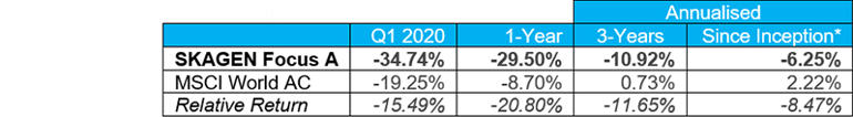 SKAGEN Focus A dropped 34.74% over the quarter, underperforming the MSCI All Country World Index which fell 19.25%.