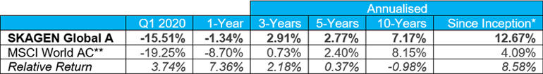 SKAGEN Global A was down 15.51% over the quarter, outperforming the MSCI All Country World Index which dropped 19.25%.
