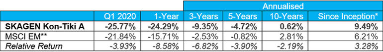 SKAGEN Kon-Tiki A fell 25.77% during the quarter, underperforming the MSCI Emerging Markets Index which dropped 21.84%.