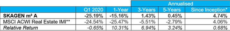 SKAGEN m² A dropped 25.19% during the quarter, underperforming the MSCI All Country World Index Real Estate IMI benchmark index which was down 24.54%.