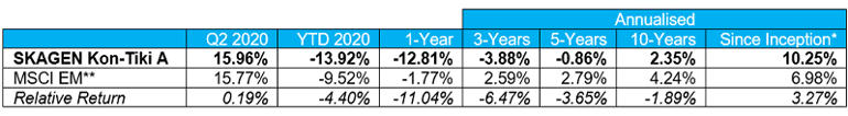 SKAGEN Kon-Tiki A was up 15.96% during the quarter, outperforming the MSCI Emerging Markets Index which rose 15.77%.