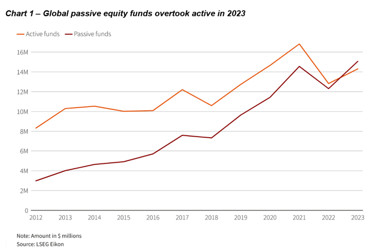 The main driver behind the parabolic spread described above is the constant flow of passive capital into equities which is effectively mechanically put to work through global market capitalisation-weighted indices. According to Lipper data, 2023 saw passive funds attract inflows of $466 billion to overtake total assets in actively managed funds for the first time. While the statistics for 2024 are not yet available, it is fair to assume that the trend continued last year.