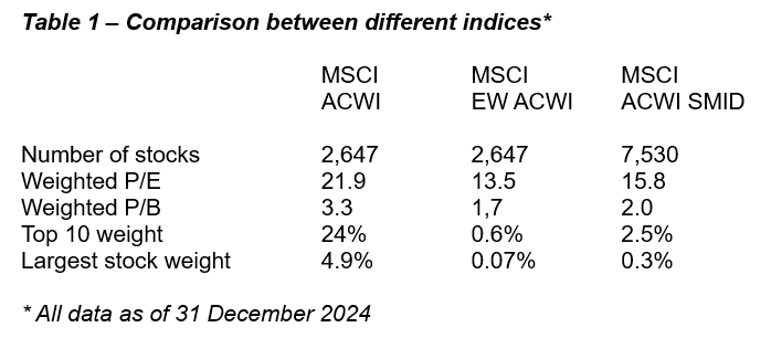 In 2024 (USD), the average global stock, defined as the MSCI ACWI Equal Weighted Index, returned 5.9 percent while a market capitalisation weighted global index returned 18.0 percent. At the end of the year, the US equity market accounted for 67 percent of the MSCI ACWI World equity index basket. These 589 stocks constitute 22 percent of the stocks listed in the index. The MSCI World excluding the US returned 5.3 percent in the year.