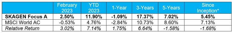 European holdings lead absolute and relative gains as strong fund performance continues. SKAGEN Focus climbed 2.50% during the month, outperforming the MSCI All Country World Index which fell 0.53%. Read the SKAGEN Focus February 2023 report for more information.
