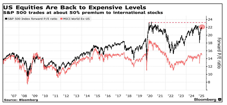 The combination of rising share prices, improving sentiment and falling earnings estimates has inevitably stretched valuations. Earnings multiples generally are above historic averages and US equities are back trading at a 50% premium versus international stocks. In Europe, valuations have climbed above their 35-year average over the first six months, leaving little room for earnings disappointment on either side of the Atlantic.