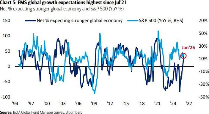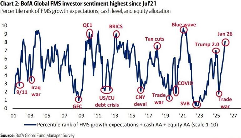 Amid the market broadening in January, US equities remained strong if not spectacular, with the S&P 500 breaking 7,000 for the first time ever and posting a solid 1.2% gain. Since 1950, when the first month of the new year has been positive, the index return over the next 11 months has also been higher 87% of the time. With the US market still representing 64% of the global index, this would likely be positive for global equities in 2026. Indeed, the headline sentiment composite of the Bank of America Fund Manager Survey, which combines equity allocation with global growth expectations, and cash levels, rose to 8.1 from 7.3, the highest since July 2021 and a sharp recovery since its ‘Liberation Day’ lows in April last year.