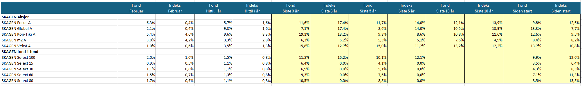 Fondet leverte sterk absolutt avkastning og slo referanseindeksen klart. SKAGEN Vekst steg 1,0 prosent i februar, mens indeksen falt 0,6 prosent. Se flere avkastningstall nederst.