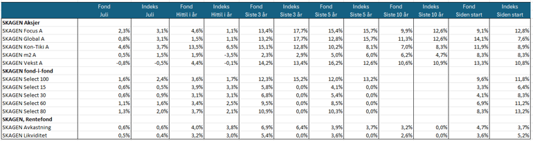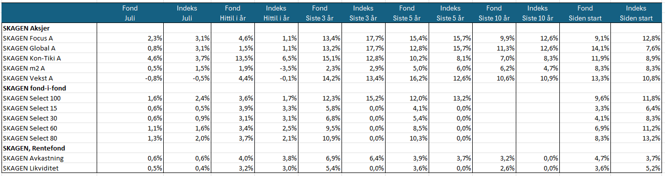 Det nordisk-globale aksjefondet SKAGEN Vekst hadde en marginalt negativ utvikling i juli, med -0,8 prosent mot indeksens -0,5 prosent. Avkastningstabell nederst i artikkelen.