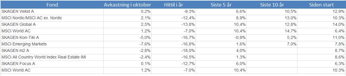 Det globale aksjefondet SKAGEN Global slo sin indeks MSCI World AC i oktober. Fondet leverte 2,5 prosent avkastning i måneden mot 1,2 prosent for indeksen. For flere avkastningstall se tabellen nederst i artikkelen.