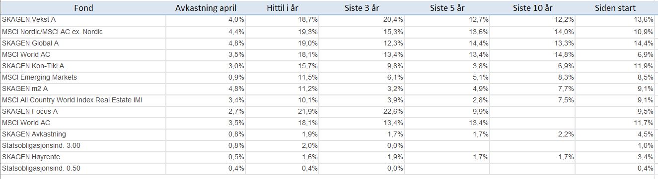 Det globale aksjefondet SKAGEN Global leverte god avkastning i april med 4,8 prosent, mot indeksens 3,5 prosent i samme periode. For flere avkastningstall, se tabellen nederst i artikkelen.