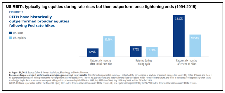Mange økonomer tror at inflasjonspresset er i ferd med å lette noe, etter hvert som farten på verdens økonomier sakker ned og flaskehalsene i leverandørleddet blir utbedret. Begge deler bør ha positiv innvirkning på presset på kapitaliseringsgraden. Det er umulig å time markedet, men det virker som at denne volatile perioden kan være et fornuftig tidspunkt for langsiktige investorer å gå inn i markedet. Når inflasjonen begynner å roe seg senkes renteforventningene. Historisk sett har det gitt massiv meravkastning for børsnotert eiendom i den påfølgende perioden (se figur).