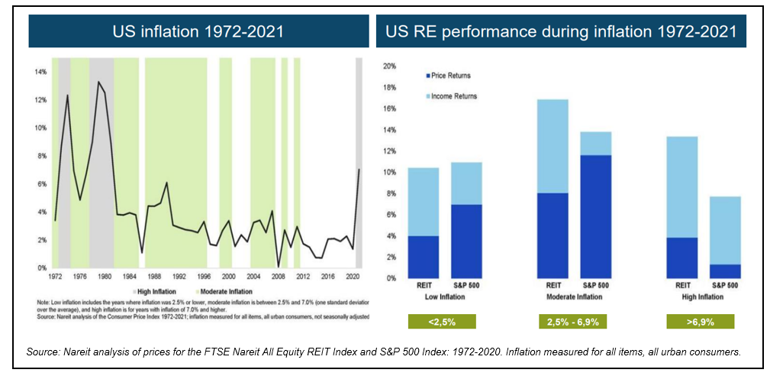 Et generelt trekk ved hele porteføljen er at fondet er investert i trenddrevne segmenter – flere med sterk prissettingskraft. Det er særlig viktig i perioder med høy inflasjon. Størstedelen har leiekontrakter med planlagte husleieøkninger i tråd med konsumprisindeksen. Det bør også gi et lite løft i de kortsiktige inntektene fremover. Denne veksten i inntjeningen er en av de viktigste driverne bak at børsnotert eiendom overpresterer markedet i perioder med høy inflasjon (se figur).