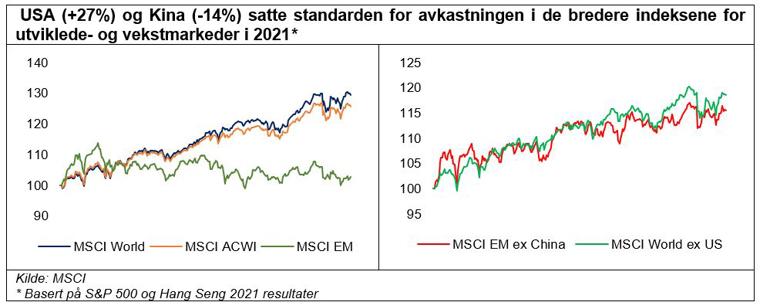Det er liten tvil om at 2021 var en mer behagelig avveksling enn året før. Verdensindeksen MSCI All Country World Index nådde flere rekorder i løpet av året, og endte på 26 prosent økning ved utgangen av 2021. Likevel var det store ulikheter mellom geografiske markeder. De utviklede markedene steg 29 prosent, mens vekstmarkedene steg 2 prosent. Dette er den største forskjellen på nær 10 år, hovedsakelig drevet av et vedvarende sterkt USA og et svært svakt Kina, som begge utgjør brorparten av sine respektive indekser[1].