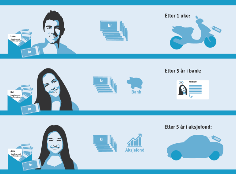 Kari sparer til sertifikat, og velger å plassere konfirmasjonspengene i banken. Bil er Annes sparemål, hun velger aksjefond for sin sparing. Hun vil gi pengene god tid til å vokse.