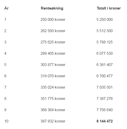 La oss si at du har 5 millioner kroner 🙂 som du satte til sparing i 10 år. Til 5 prosent rente ville dette utgjort renteinntekter på over 3 millioner kroner.