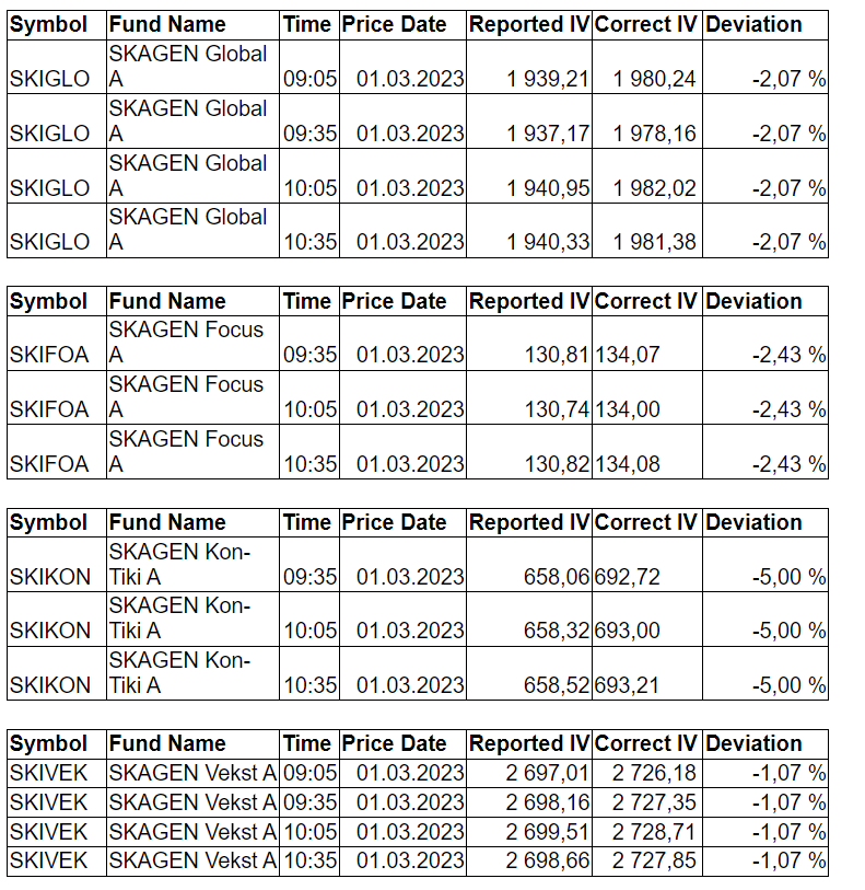 Today, we experienced problems with our IV calculations, and were not able to provide correct fund prices. The issue was resolved shortly after 11 a.m.