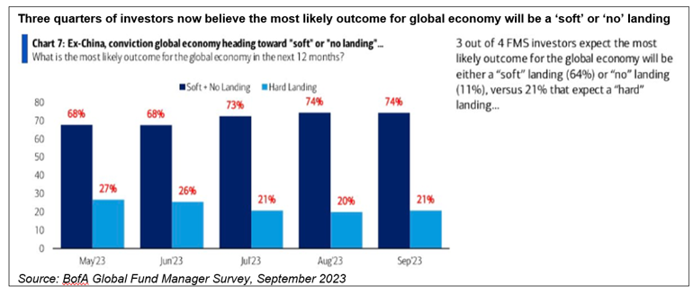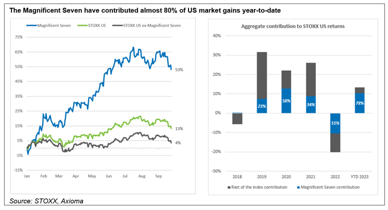 Sedan min senaste uppdatering där jag diskuterade riskerna med den obalanserade aktiemarknaden och de osäkra ekonomiska utsikterna, är jag nu mer optimistisk. S&P 500-indexet är ned 7 procent från toppen i somras (3 procent från en teknisk korrigering), och aktierna som stod för den stora uppgången avmattades under tredje kvartalet. Var och en av de magnifika sju (de sju stora teknikbolagen) presterade mycket sämre än under den föregående sexmånadersperioden, eftersom värderingarna föll, och endast tre levererade positiv avkastning. Detta ledde till att tillväxtaktier underpresterade med tre procentenheter [3] under kvartalet, även om värde fortfarande handlas nära relativt låga nivåer de senaste 30 åren och fortfarande har stor uppsida[4].