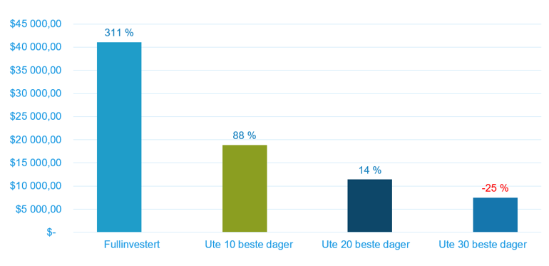 Grafen nedan (på norska) visar vilken skillnad det gör om man är borta från marknaden endast vid några få dagar. Exemplet är amerikanskt och visar hur mycket 10 000 dollar investerat i S&P 500 från 31 december 2005 till 31 december 2020 har gett i avkastning. Som du ser är det dyrt att vara ute ur aktiemarknaden, även under korta perioder.