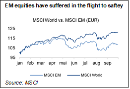 Investerare har rört sig från aktier, vilka uppfattas ha hög risk, till så kallade säkra hamnar – detta hände också vid samma tidpunkt i fjol. Penning- och finanspolitiska åtgärder bidrar till ökad optimism för företag och aktieägare i tillväxtmarknaderna, men tillväxtmarknadsindexet MSCI EM handlas med 30-40 procents rabatt jämfört med det globala indexet MSCI World, mätt efter intjäning och bokförda värden.*