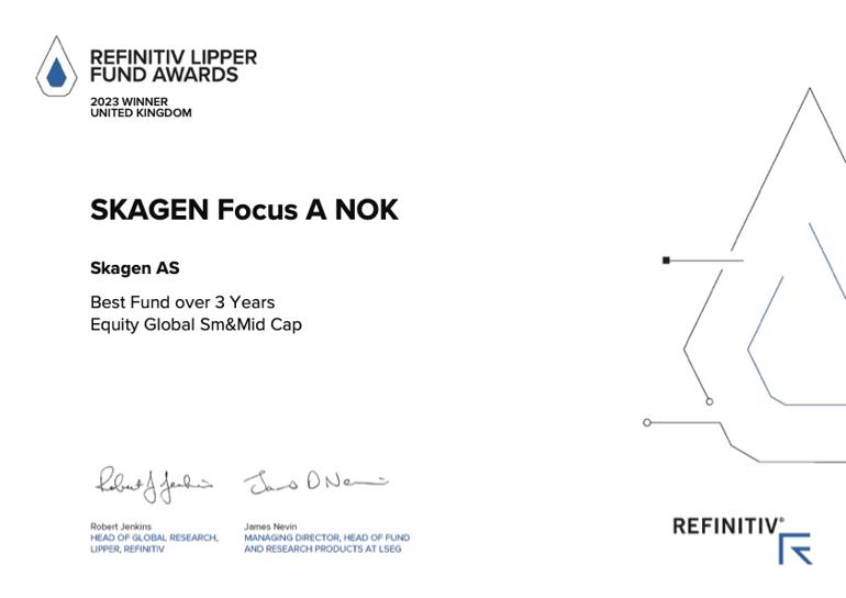 SKAGEN Fonder har tagit hem det prestigefyllda priset Lipper Fund Awards tack vare enastående prestationer med fonden SKAGEN Focus. Globalfonden, som främst investerar i mindre bolag, fick priset för bästa globala aktiefond inom små och medelstora bolag under den senaste treårsperioden vid UK Lipper Fund Awards-galan i London igår kväll. Jonas Edholm och David Harris har ansvarat för förvaltningen av fonden sedan fondens start 2015 och har lång erfarenhet av aktiv värdeförvaltning.