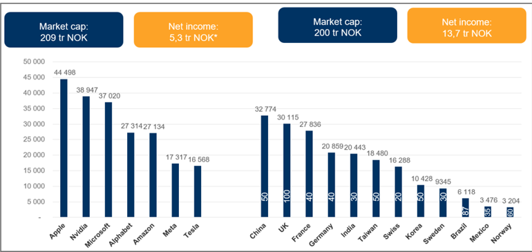 Graf 1 – Sunt förnuft? Market cap och intjäning i NOK för de största amerikanska bolagen och börser globalt