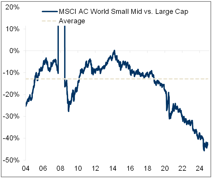 Småbolagen värderas på nivåer som aldrig skådats tidigare mot stora bolag globalt om vi studerar en värderingsvariabel som Pris / Eget Kapital. Detta är en effekt av extrema flöden in i passiva globala mandat, som köper bolag helt utan reflektion kring värdering eller fundamentala faktorer, som har drivit upp värderingarna till mycket höga nivåer, i synnerhet i de största bolagen i USA. Parallellt är många småbolag bortglömda och ignorerade och handlar med en mycket hög riskpremie, som nu kan förändras med lägre räntor och en annalkande cyklisk uppgång utanför USA.