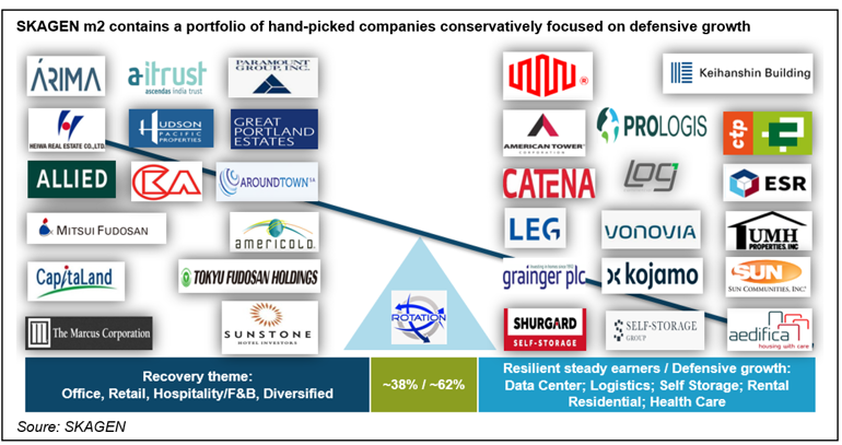 En annan viktig nyckelfaktor för att hantera risk är diversifiering, särskilt när det finns en svag korrelation i avkastning mellan delsektorer och områden. SKAGEN m2:s portfölj är mer geografiskt spridd än indexet, som för närvarande har 59,4 procents exponering mot USA-noterade bolag, nästan dubbelt så mycket som fonden (31,8 procent). Portföljen ger lika diversifiering i olika branscher som index, även om vi har noggrant positionerat portföljen för att ge andelsägarna exponering mot förvärvet efter Covid och skydd mot den ekonomiska osäkerhet som ligger framför oss.