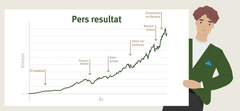 Per är däremot tydligen född i ett helt annat stjärntecken, om man tror på sådant. Han befinner sig i den andra änden av lyckoskalan. Hans investeringsstrategi var i princip identisk med Fridas. Men där hon missade som mest, träffade han rätt varenda gång. Varje gång aktiemarknaderna nådde botten och var på sin absolut lägsta nivå så flyttade han sitt sparande från banken till aktiefonden. Resultatet är imponerande. Med Pers perfekta tajming har besparingarna på 335 000 kronor vuxit till totalt 2 287 000 kronor.