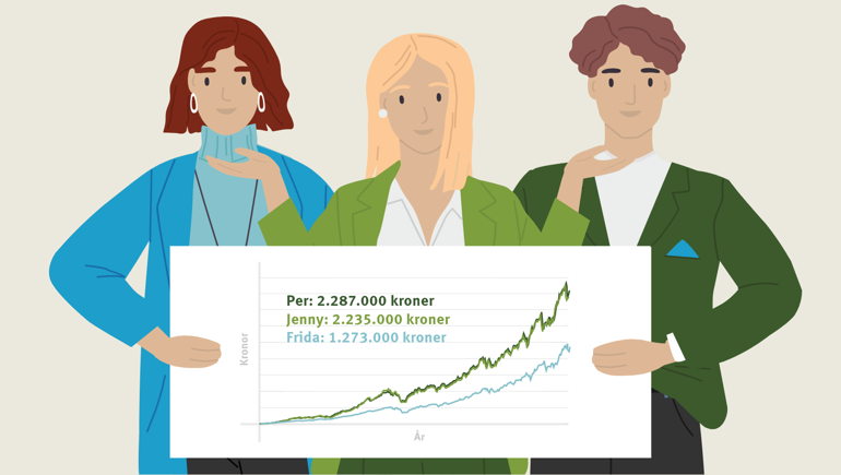Alla tre bestämmer sig för att spara 1 000 kronor varje månad. De har en lång tidshorisont och är överens om att det är smart att välja aktiemarknaden för sparandet. Alla bestämmer sig för att investera i den helt nya globala aktiefonden SKAGEN Global – som har sin allra första dag på börsen idag, sjunde augusti.