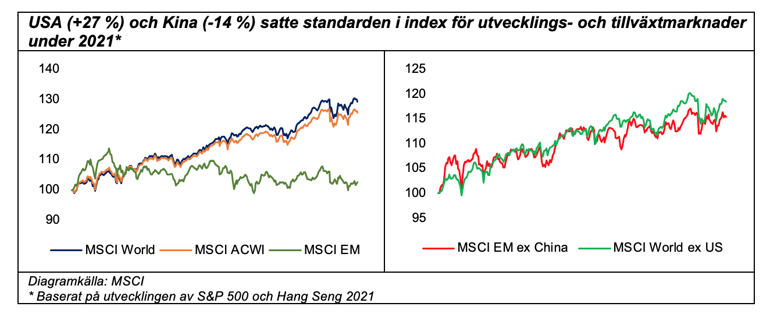 MSCI All Country World Index nådde flera nya toppar innan det stängde 26 procent högre vid utgången av 2021, även om den underliggande utvecklingen skiljde sig åt mellan olika geografiska marknader. De utvecklade marknaderna steg med 29 procent och tillväxtmarknaderna med 2 procent. Skillnaden i utveckling mellan de olika marknaderna var den största på nästan tio år, till stor del drivet av ihållande stark tillväxt i USA och en mycket svag utveckling i Kina, som utgör en stor del av viktningen i respektive index.[1]