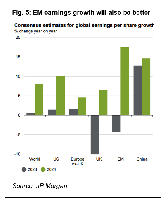 En betydande del av tillväxtmarknadernas överlägsna prestation kommer att komma från snabbt växande företag. Företagsinkomsterna förväntas öka kraftigt 2024 med en tillväxt på runt 18 % jämfört med året innan, nästan dubbelt så mycket som i USA och nästan fyra gånger högre än i Europa (fig. 5). Mycket av detta förväntas komma från Korea, där inkomsten per aktie spås växa med över 50 % i år, drivet av landets halvledarindustri och en rad statliga åtgärder för att förbättra lönsamhet och företagsstyrning (Corporate Governance).