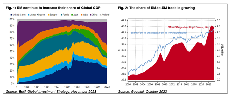 Tillväxtmarknadernas andel av globalt BNP har vuxit från ungefär en tredjedel till mer än hälften sedan millennieskiftet (fig. 1). Mycket av denna tillväxt kommer från handel mellan tillväxtmarknader med en betydande tillväxt både i dollarvärde och som en procentandel av global export under samma period (fig. 2). Dessa starka trender förväntas fortsätta, och även om sambandet mellan ekonomisk tillväxt och avkastning inte är linjärt, bidrar de till att skapa attraktiva investeringsmöjligheter inom områden som hälsa och välbefinnande, konsumtion, teknik, infrastruktur och ren energi
